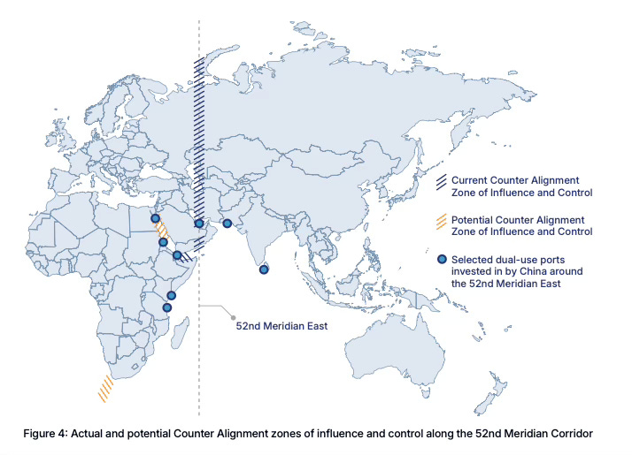 Much of Europe’s commercial bloodstream now flows along what I’ve elsewhere called the 52nd Meridian corridor: a north–south axis running from the Arctic through Russia, Iran and the Red Sea down into the Indian Ocean. Along this corridor, Chinese, Russian and Iranian influence increasingly overlaps at the very chokepoints through which Europe’s trade must pass. It is a route not of European design but of European dependence; and it is becoming more contested each year.